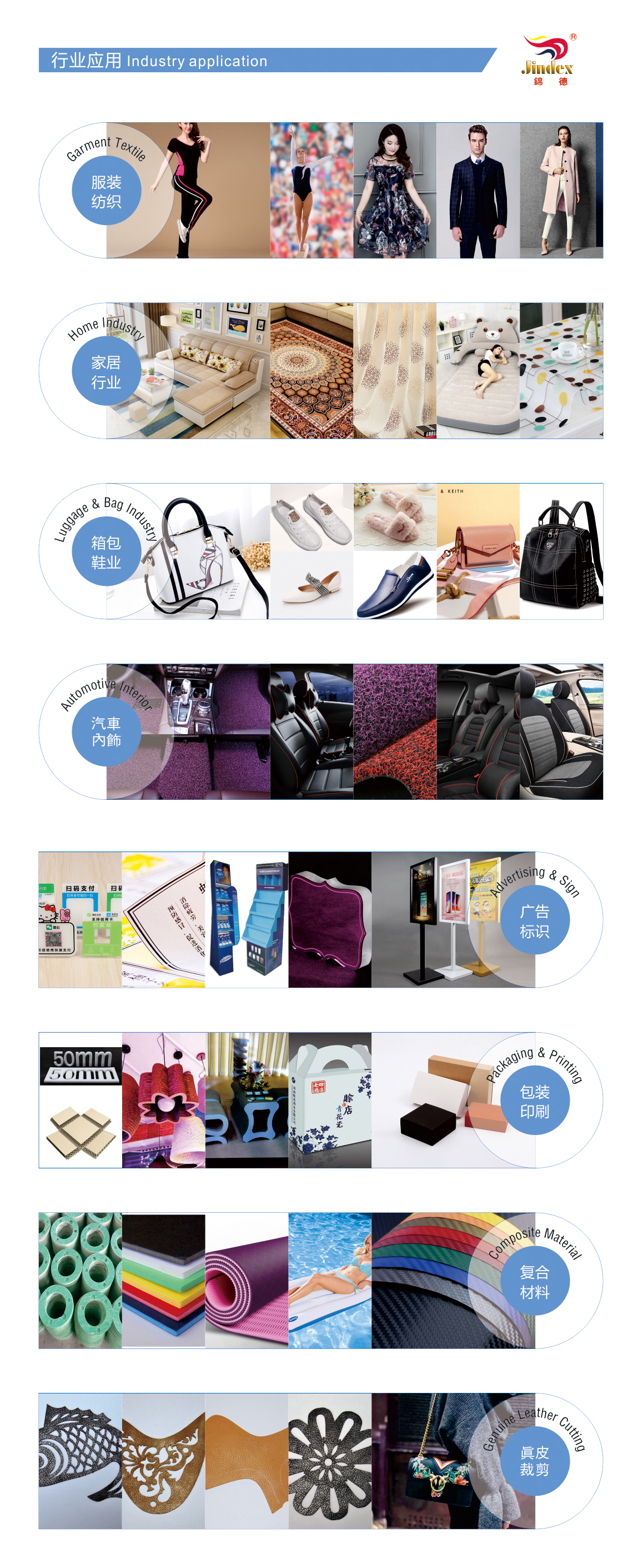 Can connect any CAD software, widely used in gasket industry, clothing industry, composite materials, luggage industry, automotive industry, advertising and printing industry, decoration industry, furniture industry and other industries of drawing and cutting.